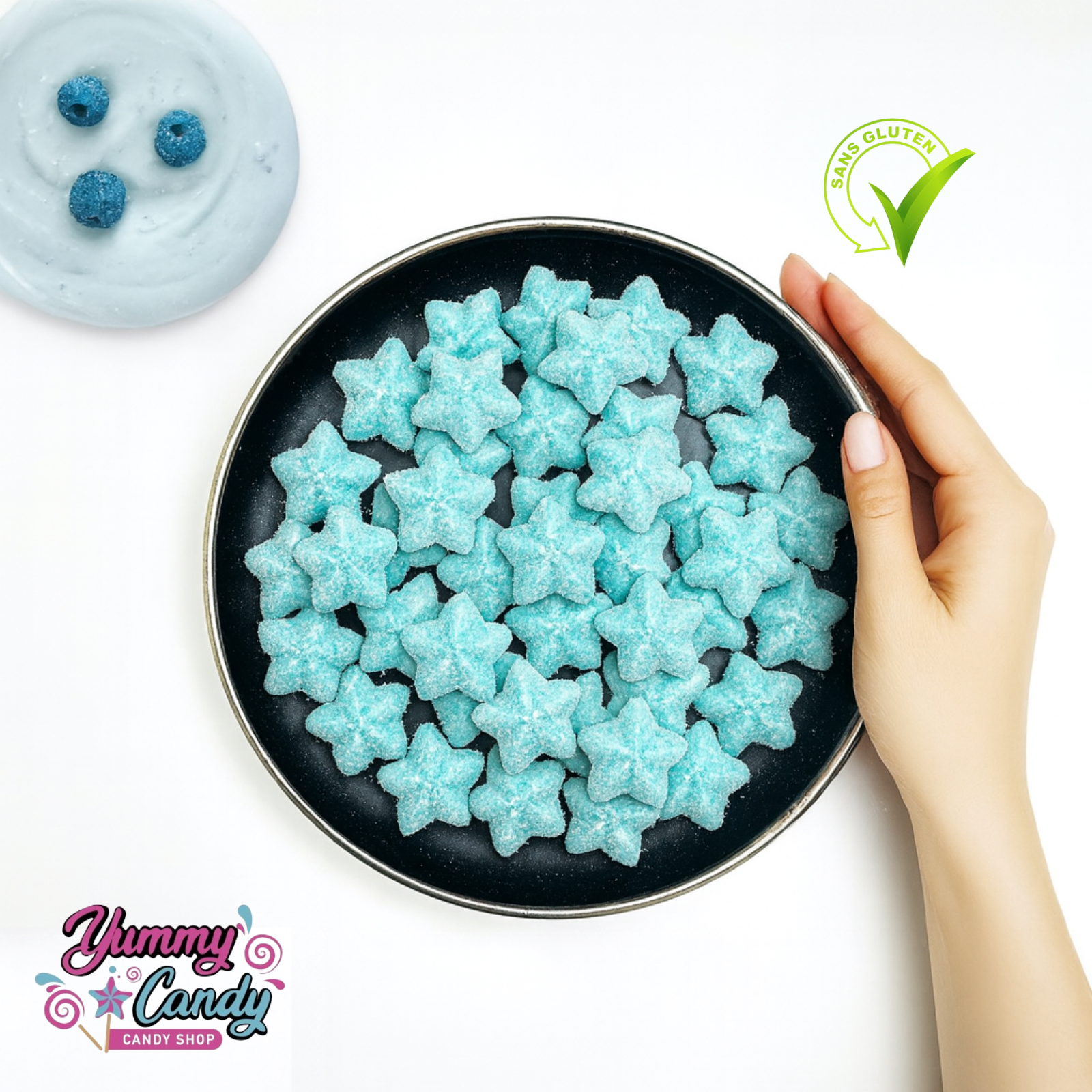 🌟 Brille avec nos Étoiles Bleues Enrobées goût Framboise, de délicieux bonbons en forme d’étoiles, à l’enrobage lisse et craquant, révélant un cœur fondant au goût intense de framboise !